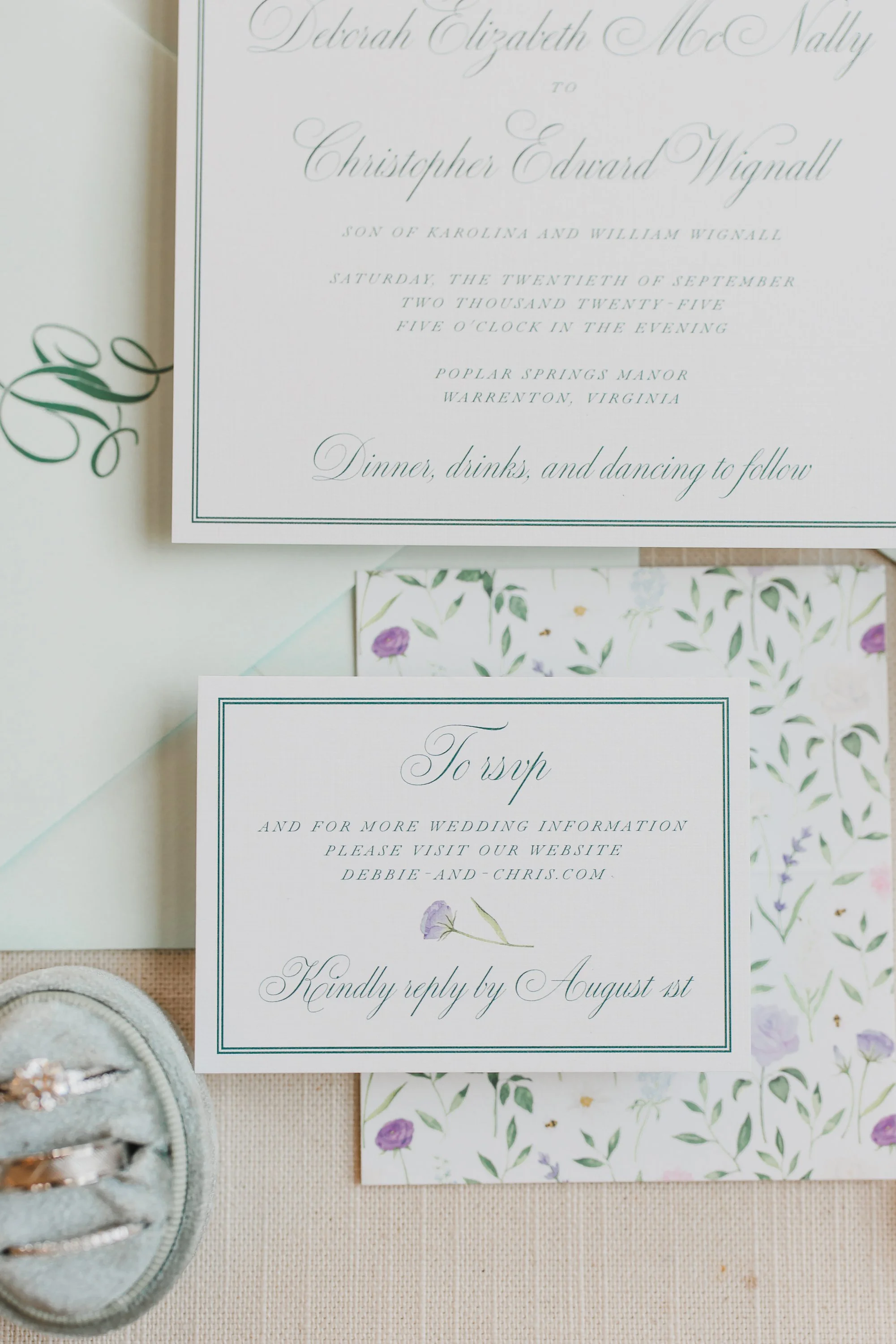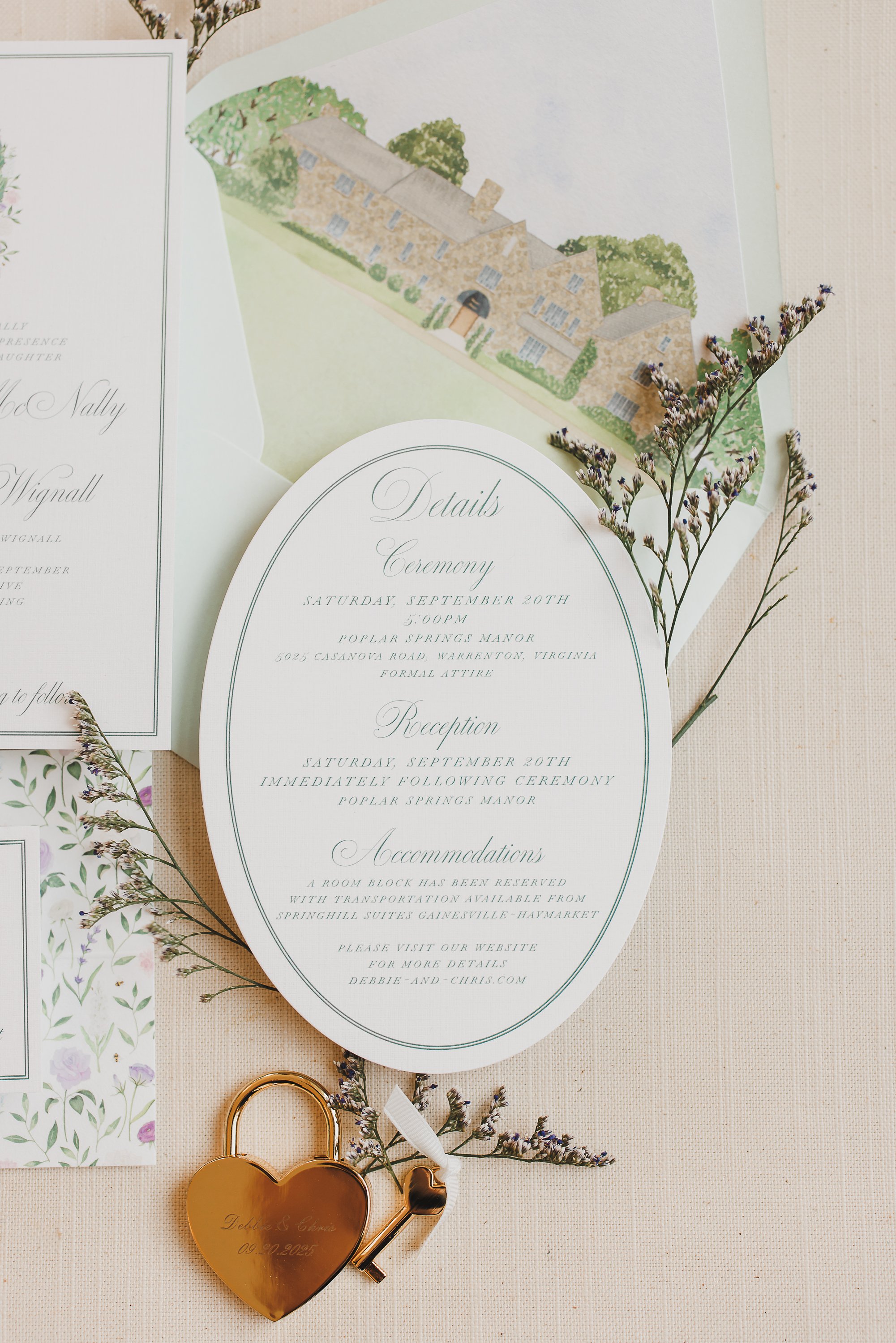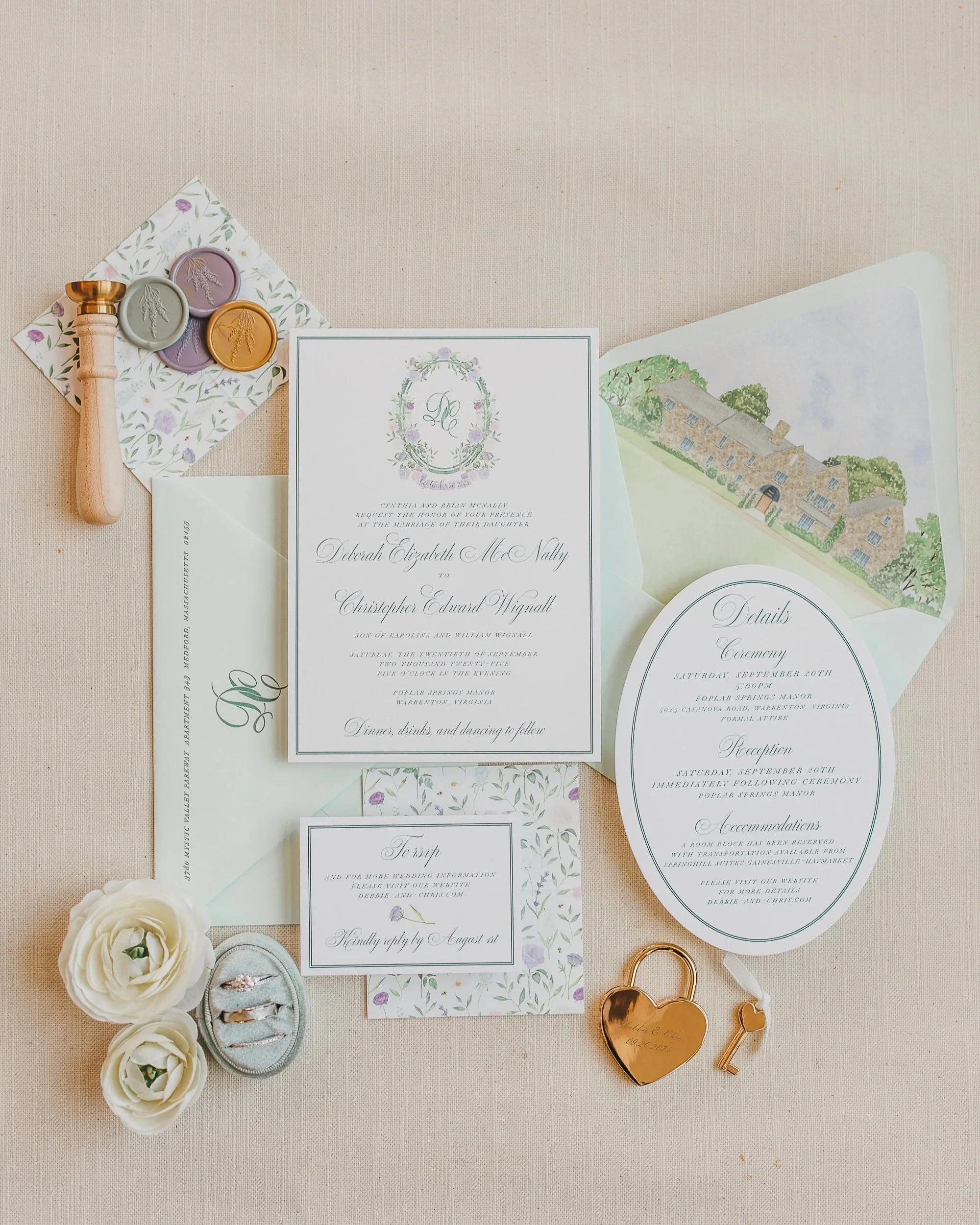 Stationery: Invitation Card, Envelope Liner, Vellum Overlay, Ribbon Belly Band & Wax Seal, RSVP Card & Envelope, Weekend Events Card, Program, Menu, Oyster Shell Place Cards