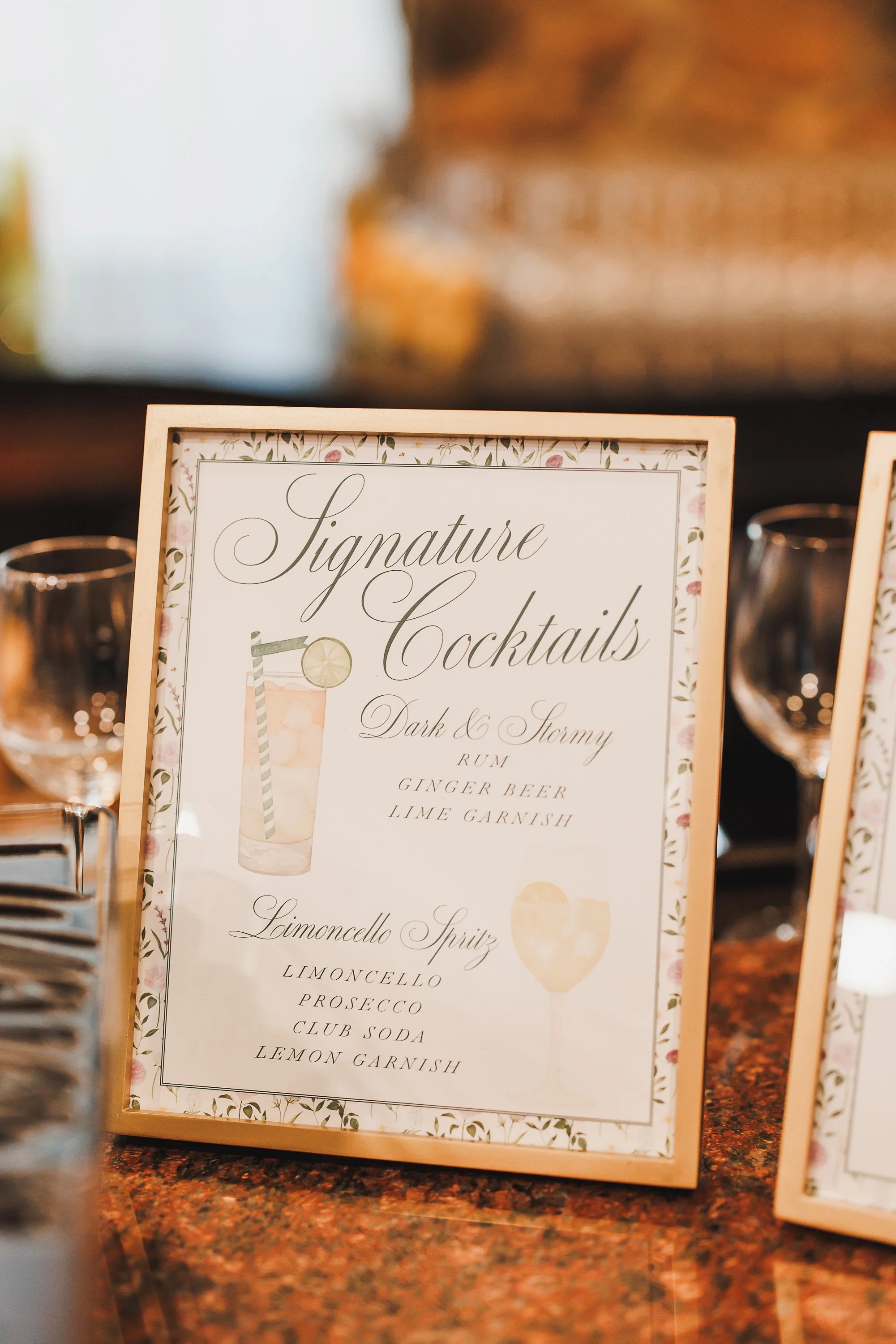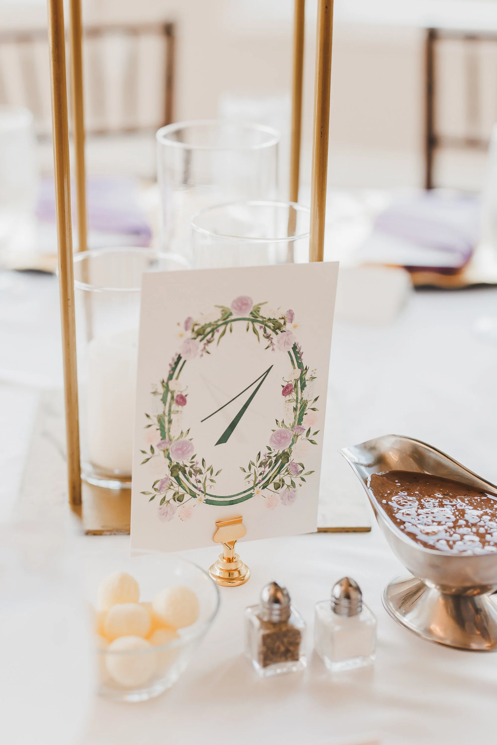 I love the combination of blues and greens in this Cape Cod Stationery Suite. Classic blue details on the Envelope and Belly Band blend seamlessly with the green florals that were pulled from the Custom Watercolor Crest on the border of the Invitation Card. A few subtle nautical elements graced the Custom Watercolor Map and Weekend Events Card, allowing the romantic details of the florals to be the focal point of the Suite. The Monogram was embroidered on Napkins and round Menus fit the chargers at the table perfectly.